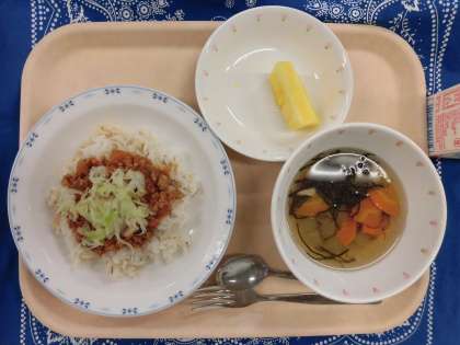 7/4 本日の給食 公開日 2022/07/05 更新日 2022/07/05 給食 〜今日の献立〜 タコライス 牛乳 もずくと冬瓜のスープ くだもの(パインアップル) 〜給食メモ〜 今日は、「タコライス」のクイズを出したいと思います。タコライスは、どこで生まれた料理でしょうか? 1. 沖縄 2. アメリカ 3. メキシコ ※クイズのこたえは、「食材がとれたところ…」の最後にのせています。 食材がとれたところ・・・ 閉じる 食材がとれたところ… 米…埼玉県 豚肉…青森県 鶏肉…青森県 にんにく…青森県 たまねぎ…愛知県 にんじん…千葉県 トマト…北海道 ピーマン…岩手県 キャベツ…愛知県 冬瓜…愛知県 しょうが…高知県 ねぎ…栃木県 パイン…沖縄県 クイズのこたえは、1の「沖縄」です。タコライスは、メキシコ料理の「タコス」の具を、ごはんの上にのせて食べたことから誕生した、沖縄県の郷土料理です。タコライスに使っている「トマト」には、体を元気にしてくれて、夏バテも予防してくれる栄養素がたくさん入っています。残さず食べましょう。