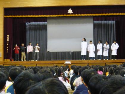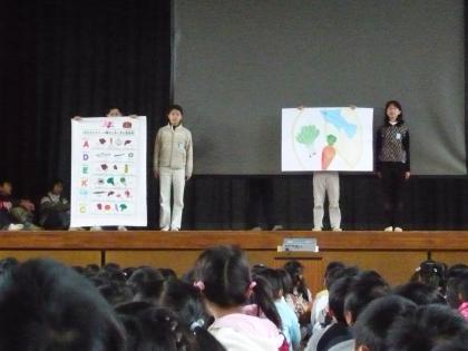 児童集会で給食委員会から発表がありました。給食の好き嫌いをなくしてほしいことや、給食は栄養のバランスがよく作られていることや、残菜の様子をスライドで知らせる内容が劇仕立てで発表されました。マイクを使わず大きな声で演技や発表ができました。