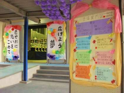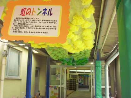 今日は展覧会の1日目です。今年のテーマは「広げよう夢 色や形に思いを込めて」です。体育館へ向かう、虹のトンネルが子どもたちを出迎えています。