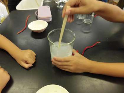 1学期最後の科学クラブは「シャボン玉」。まずは自分たちでシャボン玉の液を作りました。ビーカーに入った3種類の液体を泡立てないようによく混ぜて完成。次にモールを使って枠を作りました。「枠の形が違うと、シャボン玉の形はどうなるかな?」一般的な丸型だけではなく、星型やハート型等、好きな形の枠を作って、さあ、外へ飛ばしに Let's go!