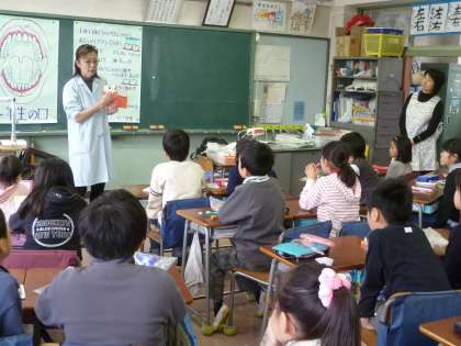 毎年恒例の粟屋先生の歯磨き教室です。4年生の子どもたちが、歯科校医の粟屋先生から歯の磨き方を直接ご指導頂きます。