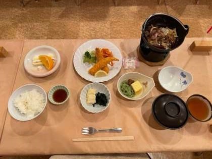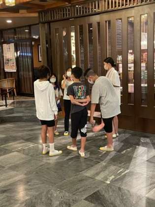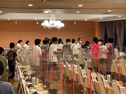 いよいよ楽しみにしていた食事です。 食事係が練習していました。