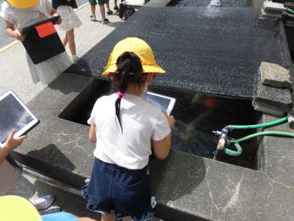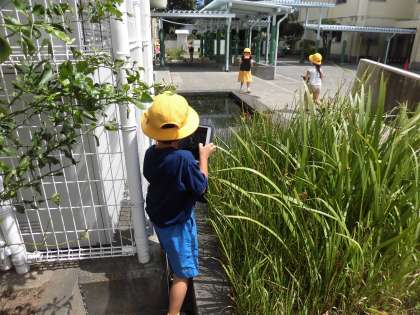 今日の生活科の学習は「いきものと なかよし」。まず身近な生き物や学校にいる生き物について知っていることを発表し合った後、先週から使い始めたiPadを生活科でも使ってみました。「校庭にはどんな生き物がいるのかな?iPadで見つけた生き物を写真に撮ってみよう!」とみんなに伝え、早速Let's go 生き物探し!池の鯉や虫など、生き物を探しながら夢中になって写真を撮っていた1年生です。