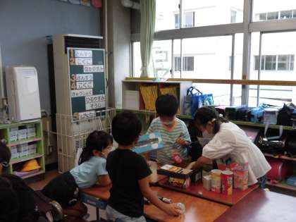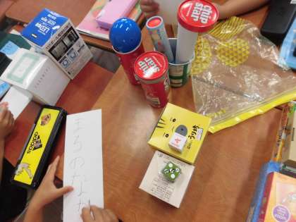 算数科では今、「かたちあそび」の学習をしています。家から持ってきたいろいろな箱をグループで集め、これまでに「どうすれば高く積めるかな?」「箱を使って何が作れるかな?」という2つの学習課題にチャレンジしました。「大きい箱を下に置いた方が高く積めるよ」「これは転がっちゃうから車のタイヤになる」等々、活動しながらいろいろなことに気付いている1年生です。今日は3つ目の学習課題「箱を形で仲間分けできるかな?」に取り組みました。グループのお友達と協力して(iPadも使いつつ…)、遊びながら形についての理解を深めています。