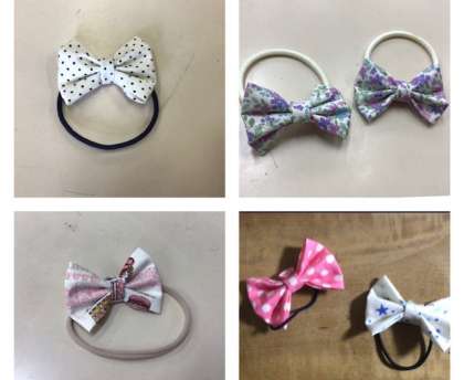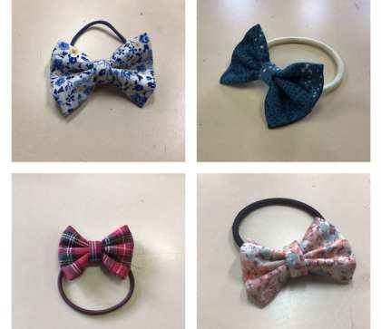 自分で用意した布や寄付していただいた布を使って、かわいいリボンを作りました。