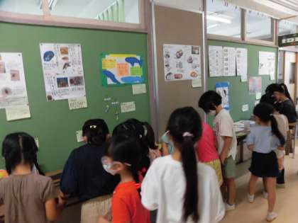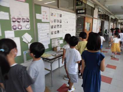 今日は校内の「夏休みの自由研究・自由作品」を見に行きました。授業中の廊下を静かに移動しながら、たくさんの作品を鑑賞しました。とても小さな声で「すごい!」「これ見て!かわいい」等々、感動を口にしていた1年生です。