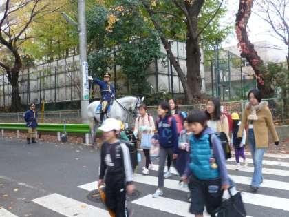 子どもたちは今朝、お馬さんに見守られて元気に登校しました。