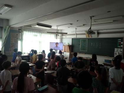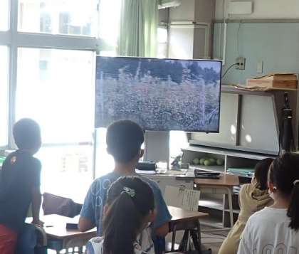 青鹿校長先生から、5年生の川場移動教室のお話がありました。木の写真の提示に「これは何だと思いますか。」と聞かれると、2年生の教室からは「りんご!」と歓声があがりました。木になっているりんごによく気がつきました。感心しました。キャンプファイヤーの写真も、食い入るように見ていました。