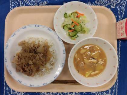10/5 本日の給食 公開日 2022/10/07 更新日 2022/10/07 給食 〜今日の献立〜 豚丼 牛乳 即席漬け さつまいものみそ汁 〜給食メモ〜 今日は、みそ汁に使った「さつまいも」のクイズを出したいと思います。さつまいもの旬(たくさんとれて、あじがいちばんいい時期)はいつでしょうか? 1. 春 2. 夏 3. 秋 4. 冬 ※クイズのこたえは、「食材がとれたところ…」の最後にのせています。 食材がとれたところ・・・ 閉じる 食材がとれたところ… 米…埼玉県 豚肉…群馬県 たまねぎ…北海道 にんじん…北海道 ねぎ…青森県 キャベツ…長野県 きゅうり…長野県 しょうが…高知県 さつまいも…茨城県 クイズのこたえは、3の「秋」です。さつまいもは、今が旬の食べ物です。さつまいもには、おなかの中をきれいにしてくれる食物繊維や、風邪を予防してくれるビタミンCがたくさん入っています。残さず食べましょう。