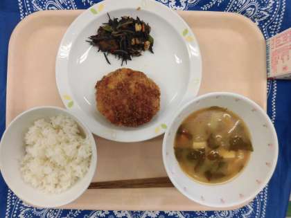 10/11 本日の給食 公開日 2022/10/12 更新日 2022/10/12 給食 〜今日の献立〜 ごはん 牛乳 きのこメンチカツ ひじきの煮つけ じゃがいものみそ汁 〜給食メモ〜 今日は、「ひじきの煮つけ」に使った「ひじき」のクイズを出したいと思います。ひじきは海にはえていますが、海の中では何色をしているでしょうか? 1. 黒色 2. おうど色 3. 白色 ※クイズのこたえは、「食材がとれたところ…」の最後にのせています。 食材がとれたところ・・・ 閉じる 食材がとれたところ… 米…埼玉県 豚肉…群馬県 大豆…北海道 たまねぎ…北海道 キャベツ…茨城県 えのき…新潟県 しめじ…長野県 にんじん…北海道 れんこん…茨城県 いんげん豆…青森県 クイズのこたえは、2の「おうど色」です。ひじきは、海の中ではおうど色ですが、乾燥させると黒色になるそうです。ひじきには、骨や歯を丈夫にしてくれる「カルシウム」がたくさん入っています。残さず食べましょう。