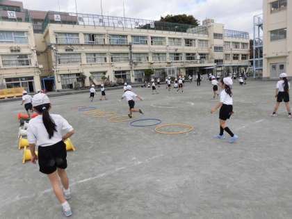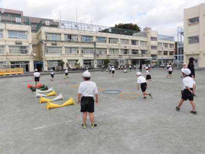10月から体育の学習で取り組んでいる「跳の運動遊び(とびあそび)」。連続で跳ぶ、遠くへ跳ぶ、リズム良く跳ぶ、片足や両足で跳ぶ…等々、いろいろな”とびあそび”にチャレンジして、仲良く運動遊びをしています。用具の準備もとても上手になった1年生です。