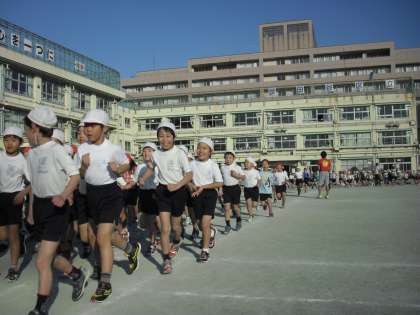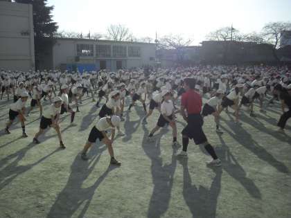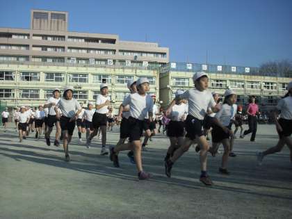 1/18 体育朝会〜マラソン朝会〜 公開日 2012/01/18 更新日 2012/01/18 校長室より 今日からの体育朝会は、マラソン朝会です。校庭を3つに分けたコースをつくって、全学年が一斉に走ります。教師は一緒に走ったり、交通整理をしたりしています。800人以上が一斉に走っている様子は壮観です。5分間、自分のペースで無理をしないで走りました。これから、少しずつ距離を伸ばしていきます。
