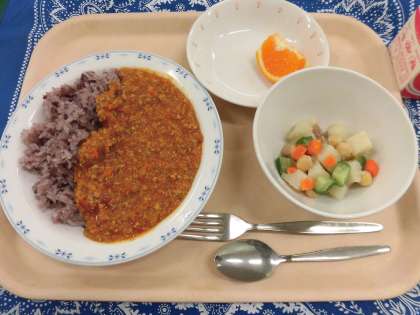 今日は、「キーマカレーライス」の「ライス」のクイズを出したいと思います。今日の「ライス」はいつもと違ってほんのり赤紫色がついています。これは、あるものをお米と一緒に炊いたからです。さて、次のうちのどれでしょうか?