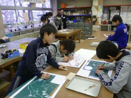 6年生は、ステンシル版画。これは卒業アルバムの表紙になりますから、みんな一生懸命です。