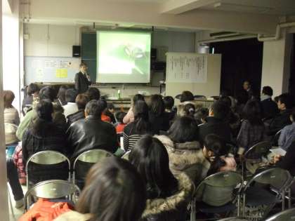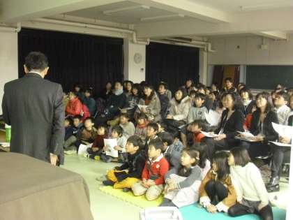 今年度、4回目のPTA家庭教育学級は「フィールドサイエンスのすすめ」です。筑波大附属小学校の理科教員として長く初等理科教育の研究をされ、現在は、早稲田大学教育・総合学術院教授でいらっしゃる露木和男先生をお迎えしました。「自然で学ぶ、科学の好きな子に育てる」をテーマに、親子を対象に講演をしていただきました。豊富な知識と絶妙な問いかけで、子どもたちを一気に惹きつけていました。子どもたちの中にも、蝶の名前をすべて答えられる子がいたり、発想豊かなな質問をする子がいたりと、好奇心の豊富さを感じて嬉しくなりました。すぐにでも本物に触れさせてみたいと思える貴重な時間となりました。