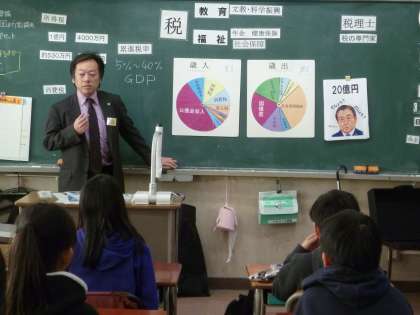 用賀小学校では、毎年6年生が税金についての学習(租税教室)をします。