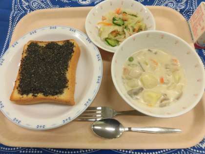 今日の給食は、「クリームシチュー」です。クリームシチューには、牛乳を使っているので、カルシウムがたくさん入っています。クイズです。クリームシチューには、牛乳だけでなく、牛乳から作られたものもいくつか入っています。さて、いくつ入っているでしょうか?