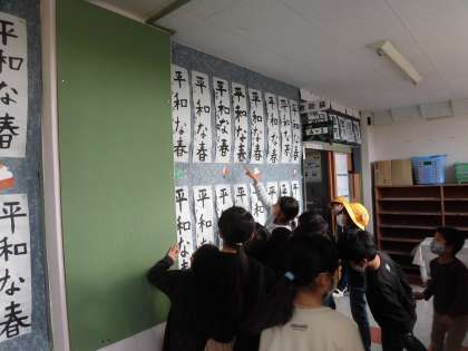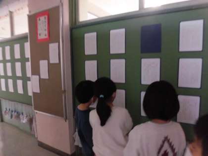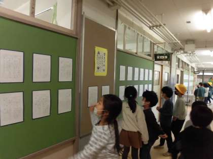 1/17 1年生 書き初めを見に行ったよ! 公開日 2023/01/17 更新日 2023/01/17 学年 今日は他の学年の書き初めを見に行きました。自分たちと同じ硬筆の2年生だけではなく、自分たちがまだやってはいない毛筆の3〜6年生それぞれの作品を興味深そうに見ながら、「字がきれい!」「お兄ちゃんのがあった!」等々、感想を話していた1年生です。