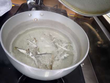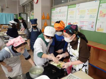 煮干しのわたを取り除き、出汁を作っていました。香りをかぎながら「いいにおい!」と笑顔で感激していました。そっと包丁を使う姿も微笑ましいものです。保護者の皆さまにお手伝いいただきました。心より感謝申し上げます。