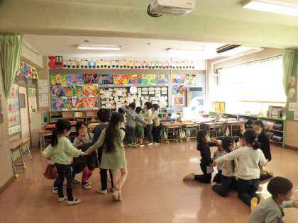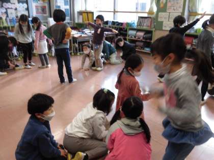 グループでいろいろな物を表現する学習の発展編「いろいろなものになりきってみよう<2>」を行いました。今日は前回と同様、「いろいろな物の様子を体を使って表現」したのですが、今回は”物の動き”も表現することが加わりました。グループでどのように表そうか話し合いをしてから…「風」を表現したり「お料理」を表現したり…。「台風を表した!」「南風に葉っぱが飛ばされているの!」「きのこ鍋をみんなで作ったよ!」「すき焼きのお鍋の中も表してみたよ!」等々、子どもたちの表現は本当に楽しく素晴らしかったです!みんな夢中になって、表現していた45分間でした。