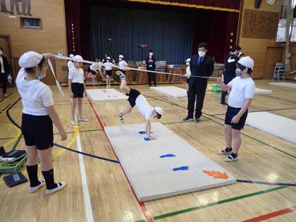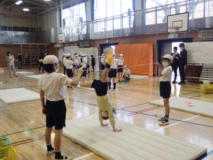 体育「マット運動」の学習で4年2組が研究授業を行いました。タブレットを活用して自分の動きを確認してから、一人一人が課題をもって授業にのぞみました。課題別のグループで必要な練習を選び、アドバイスを送り合いながら課題を解決する姿には、学び合いの姿勢が見て取れました。