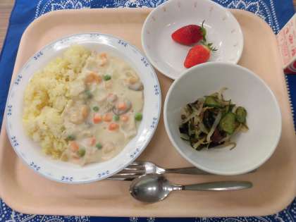 2/22 本日の給食 公開日 2023/02/22 更新日 2023/02/22 給食 〜今日の献立〜 えびクリームライス 牛乳 海藻サラダ くだもの(いちご) 〜給食メモ〜 今日は、「海藻サラダ」に使っている「もやし」のクイズを出したいと思います。もやしは、あるものから出た芽ですが、今日の「海藻サラダ」に使ったもやしは、何から出た芽でしょうか? 1.米 2.豆 3.小麦(こむぎ) ※クイズのこたえは、「食材がとれたところ…」の最後にのせています。 食材がとれたところ・・・ 閉じる 食材がとれたところ… 米…埼玉県 鶏肉…青森県 えび…インド グリンピース…北海道 たまねぎ…北海道 にんじん…千葉県 もやし…群馬県 きゅうり…茨城県 いちご…栃木県 クイズのこたえは、2の「豆」です。いつも給食に使っているもやしは豆から作られたものですが、米や小麦から作られるもやしもあるそうです。今日も残さず食べましょう。