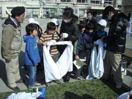 今日のふれあい広場は、防災スタンプラリーが行いました。開会式のあとは、ボーイスカウトの方々から、ひもの結び方やシーツの結び方を習い、防災に関するクイズに答えたり、バケツリレーを行ったりしました。青空の下、子どもたちは、楽しみながら防災の知識を学習しました。