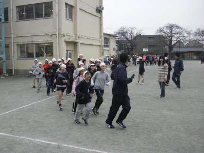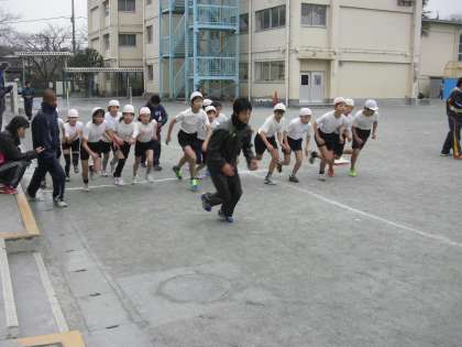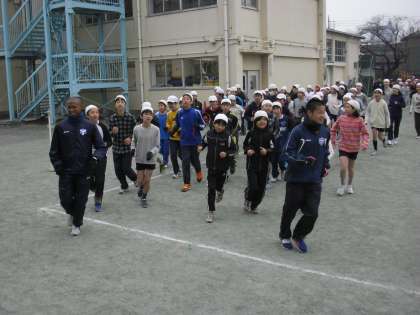 今日は、日本体育大学駅伝部の選手に来ていただき、5・6年生と一緒に走ってもらいました。5・6年生は、2月22日の駅伝大会に向けて、クラスごとにまとまり、一人一人が真剣に練習をしています。この企画は、日体大駅伝部の協力があり、昨年に引き続き実現しました。