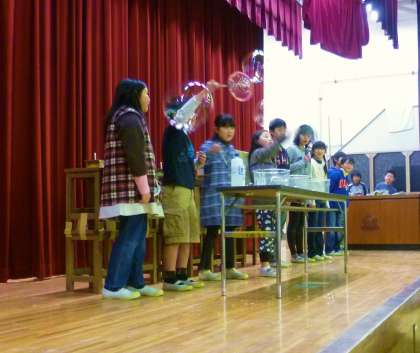 今日の児童集会は理科委員会の発表です。ダンボールを利用して、空気の力を知る空気砲の実験では、ダンボールの中にある線香の煙をとばすことでろうそくの灯を消してみせました。その他、静電気の実験やシャボン玉を作って飛ばしたりと、クイズ形式の問題と共に、子どもたちに楽しく分かりやすく説明をしていました。その姿は、まるで用賀の「でんじろう先生」のようでしたよ。理科委員会の皆さん、楽しいサイエンスショーをありがとうございました。