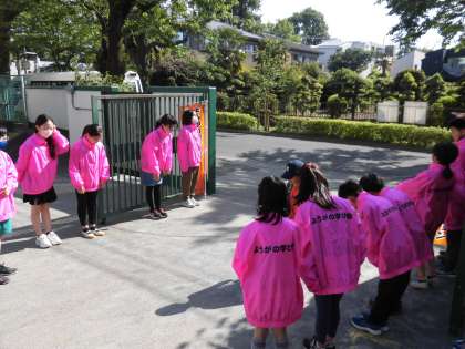 本校では、運営・代表委員の児童がピンク色のはっぴを着て旗を立て、正門に並んで登校してくる児童に向かって、元気に「おはようございます」の挨拶の声掛けをしました。