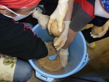 その間、真剣につぶしたりこねたりして、力いっぱい味噌玉をつくっていましたから、みんなうっすらと汗をかいています。
