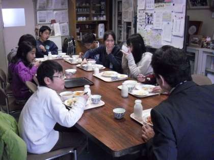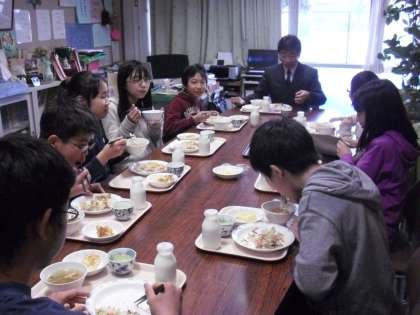 用賀小学校恒例の6年生との会食も終わりに近づきました。私が子どもたちにお茶を入れ、牛乳で乾杯をします。6年生と給食を食べながら、いろいろな話をしています。将来の夢や尊敬する人などを聞きながら、これからの中学校生活についても話したりしています。子どもたちは、はじめは緊張した面持ちですが、中盤からはずいぶんと楽しんでいます。会食は来週まで続きます。