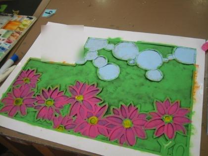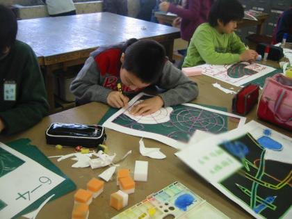6年生は、図工の時間に自分の卒業アルバムの表紙を制作しています。型のデザインを描いてカッターで切り取り、ステンシルの技法で作っていきます。集中して細かいところに気をつけながら切り取っています。スポンジを使って色をつけていきます。世界にたった一つの自分だけの表紙です。できあがりが楽しみです。