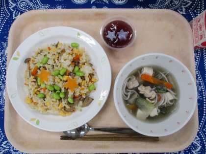7/7(金) 本日の給食 公開日 2023/07/07 更新日 2023/07/07 給食 ちらしずし 牛乳 七夕汁 七夕ゼリー 主な食材と産地 鶏肉 宮崎県 たまご 青森県 にんじん 千葉県 しょうが 高知県 ごぼう 群馬県 しめじ 長野県 とうがん 神奈川県 おくら 群馬県 ねぎ 茨城県