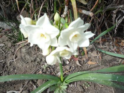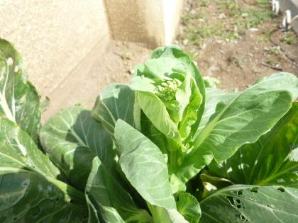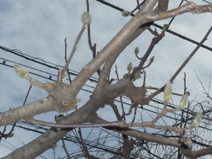 昨日と今日の暖かさで、白もくれんの花芽がふくらみ、すいせんが咲いています。花壇に残っていたチンゲンサイが大きくなって、今にも菜花が咲きそうです。