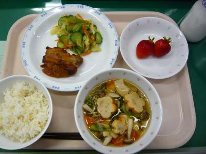 3/19 本日の給食 公開日 2012/03/19 更新日 2012/03/19 給食 きびごはん 牛乳 鶏肉のからみそ焼き アスパラのサラダ 春の五目汁 くだもの(いちご) 毎月19日は食育の日です。今日の献立は、ようがの学び舎で一緒に勉強している京西小学校、用賀中学校と同じメニューです。今日の献立には、アスパラガスや菜の花、いちごといった旬の食材を使っています。まだまだ寒い日が続いていますが、春を味わってみてください。 食材がとれたところ・・・ 閉じる 鶏肉…岩手県 長ねぎ…千葉県 キャベツ…愛知県 きゅうり…群馬県 アスパラガス…佐賀県 人参…千葉県 たまねぎ…北海道 しめじ…長野県 菜の花…千葉県 りんご…山形県 いちご…福岡県