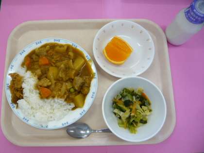 4/10 本日の給食 公開日 2012/04/10 更新日 2012/04/10 給食 〜今日の献立〜 カレーライス 福神漬 牛乳 わかめサラダ くだもの(清見オレンジ) 今日から給食が始まりました。写真は、今日の給食と、用賀小学校の給食を作って下さっている調理員さん方です。給食室では、みなさんに栄養いっぱいでおいしい給食を食べてもらえるように、調理員さんと栄養士が力を合わせて給食を作っています。1年間よろしくお願いします。 食材がとれたところ・・・ 閉じる 豚肉…青森県 鶏がら…青森県 豚骨…青森県 じゃがいも…北海道 にんにく…青森県 たまねぎ…北海道 セロリ—…茨城県 にんじん…徳島県 しょうが…高知県 キャベツ…愛知県 きゅうり…埼玉県 りんご…青森県 清見オレンジ…愛媛県