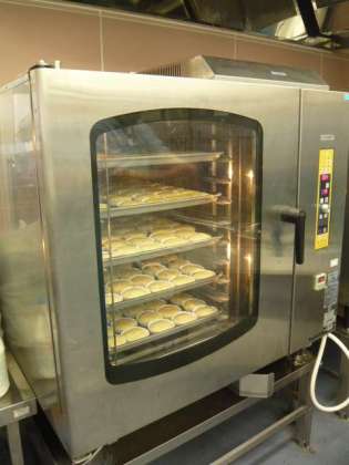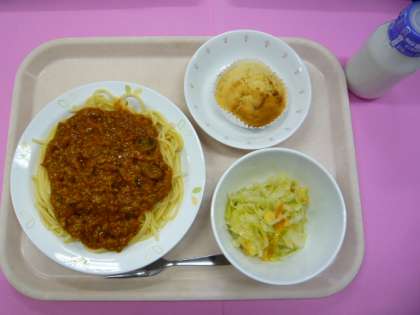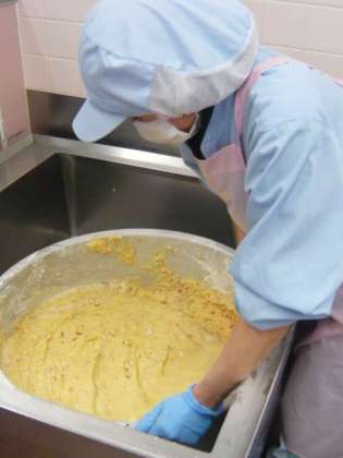 写真は、今日の給食室の様子です。いちごマフィンを作っているところです。まず、大きなたらいで生地を作ります。800人分の生地を混ぜるのはとっても力のいる作業です。そして、たくさんのカップに1つ1つ生地を入れて、1回に200個焼ける大きなオーブンで焼いて出来上がりです。