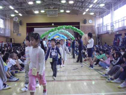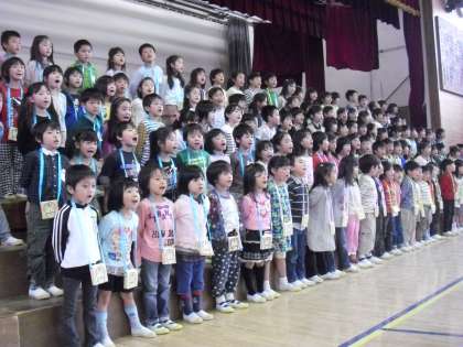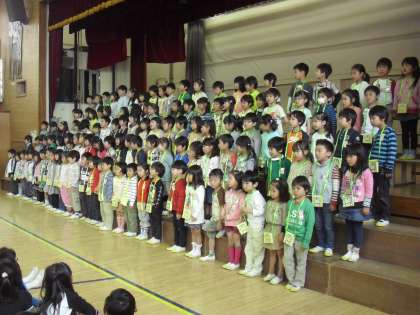 いよいよ1年生の出番です。「どきどきどん1年生」の歌をとても元気よく、強弱もつけて上手に歌っていました。これで全校児童の仲間入りです。明日から、1年生も校庭遊びができることになります。
