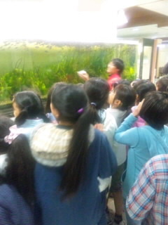博物館の見学です。ミヤコタナゴが一斉に餌を食べる様子を見て驚いています。