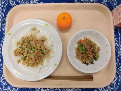 11/10(金) 本日の給食 公開日 2023/11/11 更新日 2023/11/11 給食 高野豆腐のそぼろ丼 牛乳 キャベツのあっさりあえ みかん 主な食材と産地 とりにく 青森県 こまつな 東京都 しょうが 高知県 たまねぎ 北海道 にんじん 千葉県 さやいんげん 山形県 キャベツ 愛知県 もやし 栃木県 みかん 愛媛県