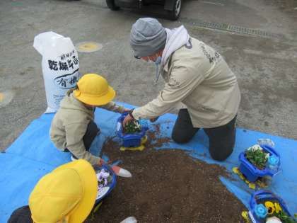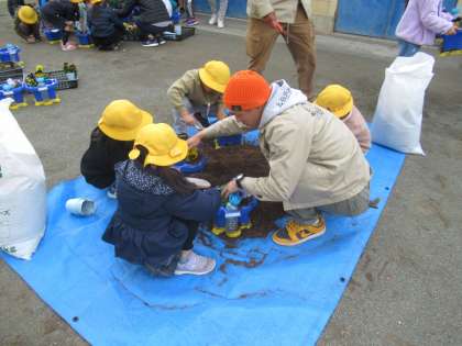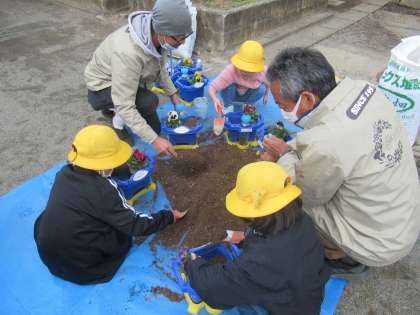 花卉園芸組合の方々にゲストティーチャーとしてお越しいただき、チューリップとパンジーの植え付けを教えていただきました。植えた後、手入れの仕方も教わりました。「きれいだね。」「だいじに育てようね。」というという子どもたちの声が聞こえてきました。