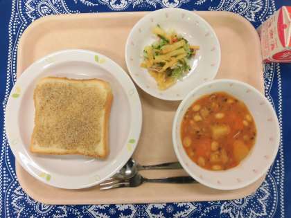11/20(月) 本日の給食 公開日 2023/11/26 更新日 2023/11/26 給食 セサミトースト 牛乳 豚肉と豆のトマトシチュー パリパリサラダ 主な食材と産地 ぶたにく 青森県 じゃがいも 北海道 たまねぎ 北海道 にんじん 千葉県 きゃべつ 愛知県 きゅうり 埼玉県