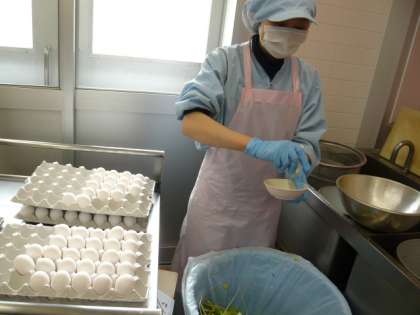 写真は、蒸しパンをつくっている様子です。安全な給食を食べてもらうために、給食室では作業によってエプロンをかえています。写真は、生の卵を使っているところなので、ピンクのエプロンをしています。