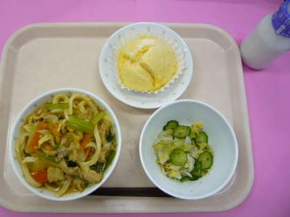 今日の蒸しパンにはチーズが入っていました。チーズには、カルシウムが牛乳の約6倍はいっています。小学生の時期は骨が成長する時期なので、カルシウムをきちんととることが大切です。カルシウムはとりにく栄養素なので、給食では1日に必要な量の半分がとれるようになっています。