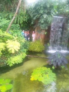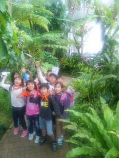 珍しい熱帯植物を興味深く観察しています。温室の中は少し暑いです。