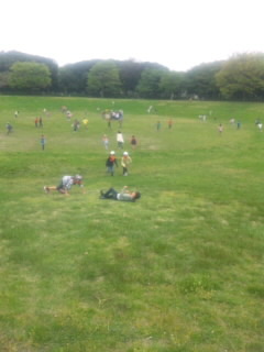 熱帯植物園の広場で遊んでいます。このあとバスで学校に帰ります。