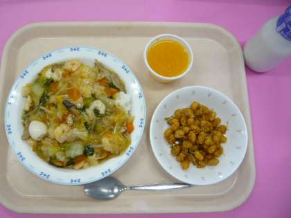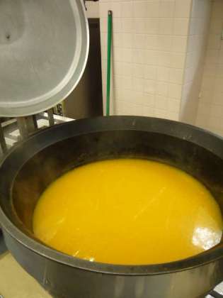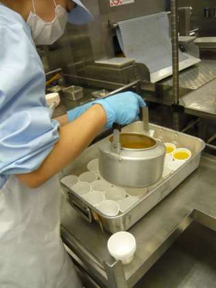 写真は、ゼリーを作っている様子です。今日のみかんゼリーにはみかんの果肉も入れてみました。釜でジュースとミキサーにかけたみかん缶の果肉、寒天、ゼラチン、砂糖を加熱して、1つ1つのカップに流しいれます。「おいしかったです。」と言ってもらえてとてもうれしかったです。