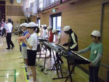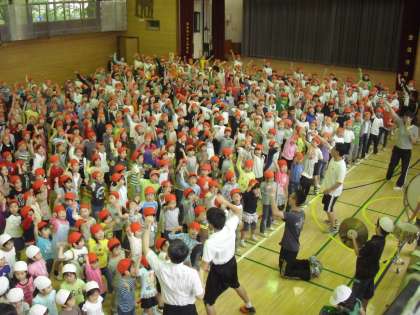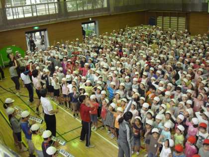 5/9 音楽集会〜運動会の歌〜 公開日 2012/05/09 更新日 2012/05/09 校長室より 今日の音楽集会は運動会の歌の練習です。校庭は、創立55周年記念写真の準備のため、体育館での練習となりました。赤白に分かれて練習開始です。赤組からのスタートでしたが、出だしからとても大きな声が出ていました。続いて歌う白組はさらに大きな声で歌い、最後に両者が歌うところでは、体育館が割れんばかりの大きな声が交錯していました。歌を聞いて子どもたちのものすごい気合いが感じられました。