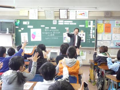 用賀小学校では、毎年6年生が租税教室で勉強しています。専門の税理士の先生が授業をしてくださいますが、私たち教師も顔負けのすばらしい授業でした。